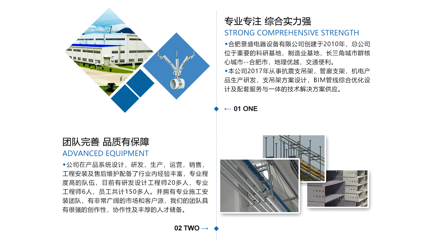 合肥景盛電器設(shè)備有限公司創(chuàng)建于2011年,注冊(cè)資本3000萬(wàn),總公司位于中國(guó)重要的科研基地,制造業(yè)基地,長(zhǎng)三角城市群中心城市-----合肥市,地理位置好,交通方便。本公司2017年從事抗震支吊架,電纜橋架,機(jī)電產(chǎn)品生產(chǎn)研發(fā),支吊架方案設(shè)計(jì),BIM管線綜合優(yōu)化設(shè)計(jì)及配套服務(wù)與一體的技術(shù)解決方案供應(yīng)。公司在產(chǎn)品系統(tǒng)設(shè)計(jì),研發(fā),生產(chǎn),運(yùn)營(yíng),銷(xiāo)售,工程安裝及售后維護(hù)配備了行業(yè)內(nèi)經(jīng)驗(yàn)豐富,服務(wù)程度高的隊(duì)伍,目前有研發(fā)設(shè)計(jì)工程師20多人,工程師6人,員工共計(jì)150多人。并擁有施工安裝團(tuán)隊(duì),有非常廣闊的市場(chǎng)和客戶(hù)源,我們的團(tuán)隊(duì)具有很強(qiáng)的創(chuàng)作性,協(xié)作性及豐厚的人才儲(chǔ)備。 公司先后通過(guò)ISO9001:2015質(zhì)量管理體系認(rèn)證...
